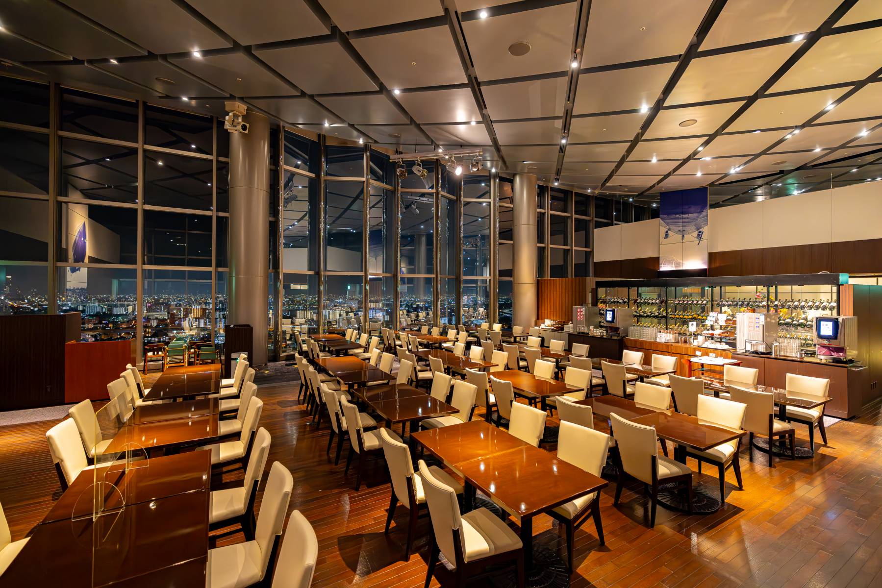 The interior is designed to resemble an airship. From the 7-meter high windows, you can enjoy a panoramic view of the nightscape.