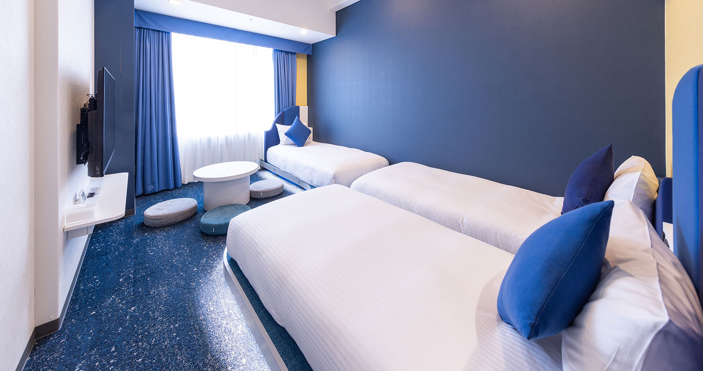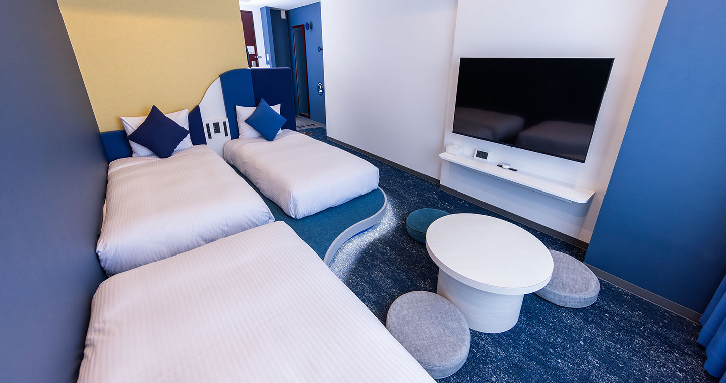 ・25平米 ・可入住人数:2~3人※最多加1张床同住3个人 ・一体式浴卫间 ・采用错层设计的低床房型 ・一个6岁以下的儿童可以与一位成人共用一张床