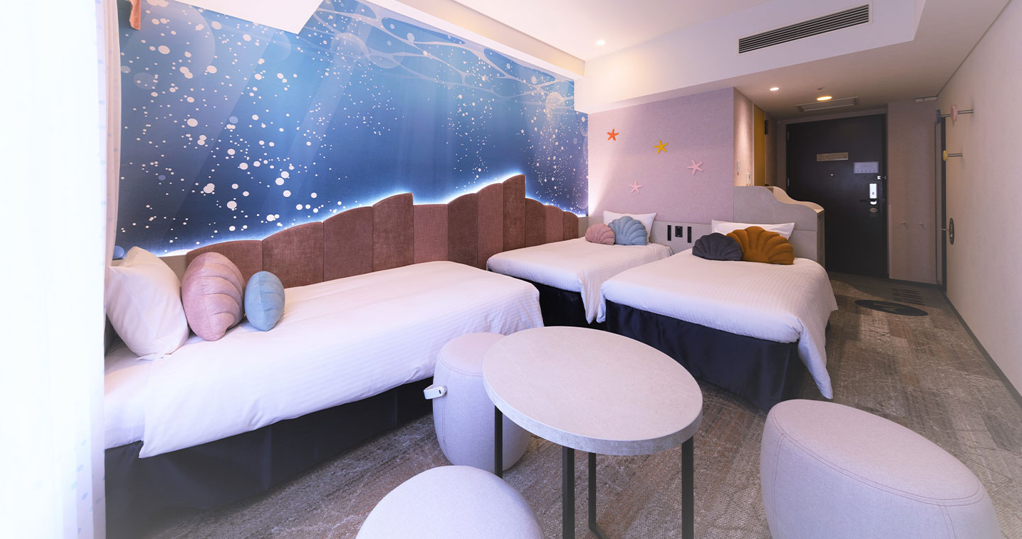 ・25平米 ・可入住人数:2~3人※最多加1张床同住3个人 ・一体式浴卫间 ・以海底世界为设计灵感 ・一个6岁以下的儿童可以与一位成人共用一张床